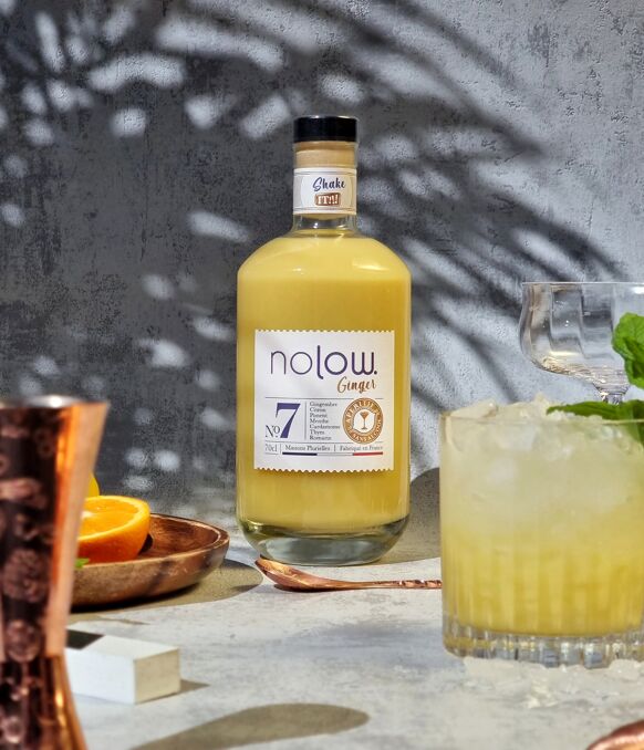Apéritif au gingembre et épices Made in France Nolow Ginger est un elixir de gingembre sans alcool. Aperitif de gingembre, citron, menthe, cardamone, thym, romarin, piment. Parfait pour boire avec de l’eau gazeuse tout simplement. Egalement possible de revisiter les cocktails classiques comme le Moscow Mule.